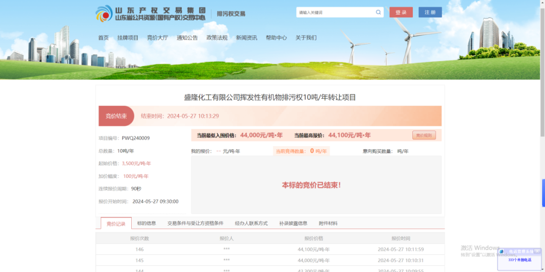 枣庄市于2023年着手开展排污权有偿使用和交易试点工作,制定了《枣庄市排污权有偿使用和交易试点暂行办法》及其配套文件,形成了“1+4”排污权交易体系,把挥发性有机物和颗粒物两项指标纳入试点。经过紧锣密鼓的筛选、审核、协调等前期工作,2024年4月份开始开展排污权受让方和转让方的申请受理,共有10家企业申购排污权,2家企业转让排污权。在山东省公共资源(国有产权)交易中心受理转让申请、挂牌公告、意向登记后,5月27日上午9:30盛隆化工有限公司10吨/年的挥发性有机物排污权实施竞拍,共6家企业参与,最终2家企业竞得,最高报价达44100元/吨·年,打破2022年以来全省2批次5个市排污权交易试点的最高竞价记录。充分体现了“环境有价、污染付费”的生态环境发展理念。