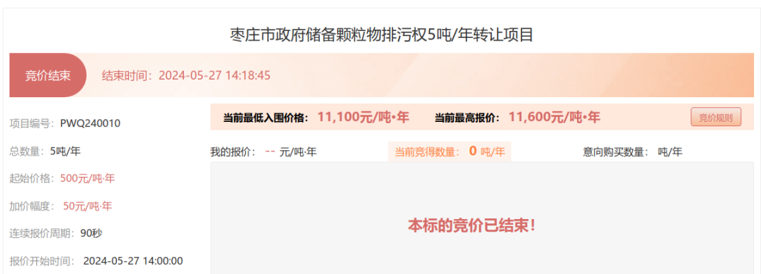 5月27日上午,枣庄市首笔挥发性有机物排污权交易以最高报价44100元/吨·年成功完成竞拍,成交总金额超过200万;5月27日下午,首笔颗粒物排污权交易以最高报价11600元/吨·年成功完成竞拍,成交总金额超过25万。